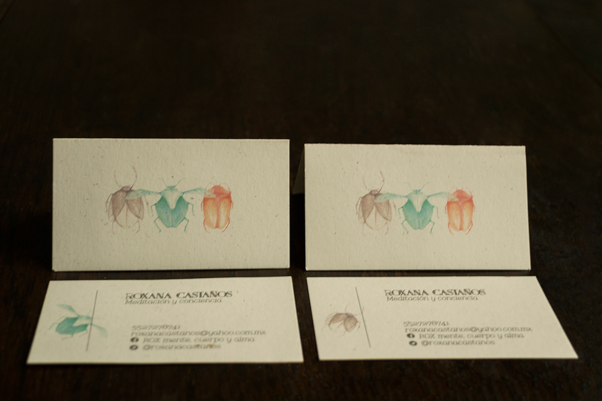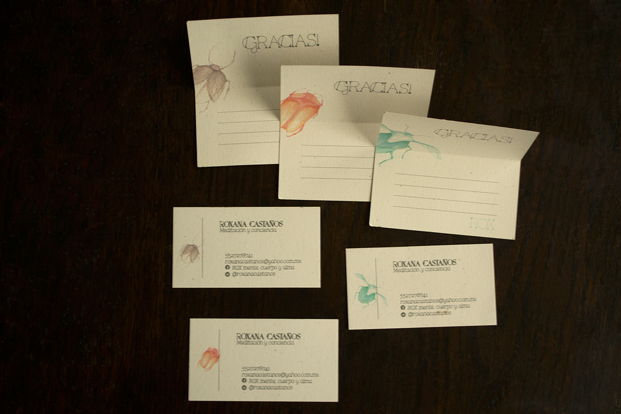 ROX is a spiritual teacher. She already had her logo and 3 bugs. I worked with her on Business and thank you cards. We made 3 cards, each with a different bug at the front but 3 bugs on the back. People would randomly get a different card